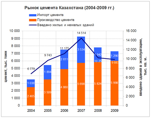 Цемент это основа строительной индустрии любого государства. Рынок цемента в Казахстане рос параллельно рынку недвижимости и промышленного строительства. Все возрастающие объемы строительства в Казахстане при ограниченном предложении в 2007 г. вызвали резкий скачок цен на цемент и скачок объемов импорта. Так в 2007 г. (в этом году бы достигнут максимум строительства за рассматриваемый период) было введено в эксплуатацию около 14 млн. кВ. метров зданий. Из них около 47% объектов жилого назначения и около 53% объектов нежилого (административного, социального, промышленного назначения). В этом же году был достигнут максимум объема рынка цемента – свыше 9 млн. тонн.
