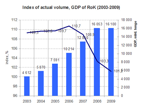 As shows diagram In 2009 there was a recession in economy of Kazakhstan. Annual GDP has grown only on 1,2 %. If to consider data for the first quarters we will see, that in 2010 GDP has increased on 7%. The reason was the considered state policy about an exit from crisis, state support of domestic bank system, a good conjuncture in the raw materials markets, absence of a panic at the population and business of Kazakhstan and the good relation to Kazakhstan in the world markets.