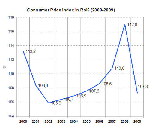 Diagram shows the «heating» of national economy from 2003 to 2007. Sharp growth of consumer prices in 2008 first of all has been caused by the crisis in economy and unavailability of the government to such rapid influence. But in 2009 a situation shows has strongly changed consumer price index has come nearer to optimum values and has became about 7 %.