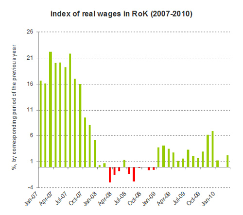 Till autumn of 2007 dynamics of the real wages index was very high (more than 15 %). Since September, 2007 this indicator starts reduce sharply, and in 2008 the real wages pass to a negative zone. It means that purchasing power of the inhabitants reduces. But since January 2009 positive dynamics was restored and keeps and a positive zone throughout all year.