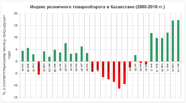 На волне опасений по поводу второй волны кризиса в Казахстане, возможной из-за падения спроса в секторе FMCG, решил рассмотреть статистику по динамике торговли в Казахстане. Статистика по объемам розничного товарооборота с 2008 по лето 2010 г. показывает, что кризис действительно снизил объемы торговли. 2009 г. был самым трудным для торгующих сетей. Но начиная с 2010 г. объемы товарооборота восстанавливаются. Так в июне 2010 г. объем товарооборота в Казахстане превысил показатель июня 2009 г. на 17%, при этом, позитивный тренд наблюдается на протяжении всех 6 мес. 2010 г.