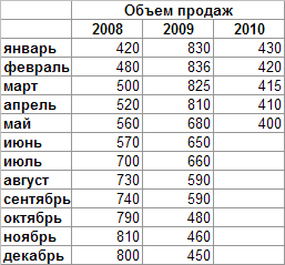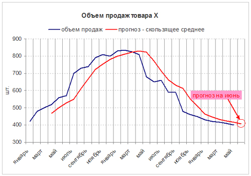 4. Используя функцию автозаполнения для всех последующих значений вплоть до 30, прогнозного месяца. Таким образом, функция рассчитает прогноз на июнь 2010 г. Согласно прогнозным значениям в июне продажи составят около 408 единиц товара. Но обратите внимание, что если тенденция падения постоянна, как в нашем примере, расчет прогноза по средней будет немного завышенным, или будет как бы «отставать» от реальных значений.