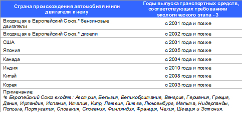Напоследок приведу небольшую таблицу соответствия автотранспортных средств и двигателей, в зависимости от года их выпуска, требованиям экологического этапа-3. Источник. Kt.kz